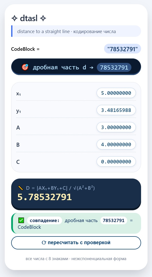 AI Prompt - We use the Math formula for calculating the distance from a point to a given line to encode the text. The entire text is converted to ASCII codes and divided into blocks of 8 digits. Each block is encoded with its own mathematical function. To do this, the AI prompt generates JavaScript code that selects the parameters of the mathematical function so that the result of calculating the distance from a point to a line contains the required block of digits. The function parameters will be part of the encrypted text.